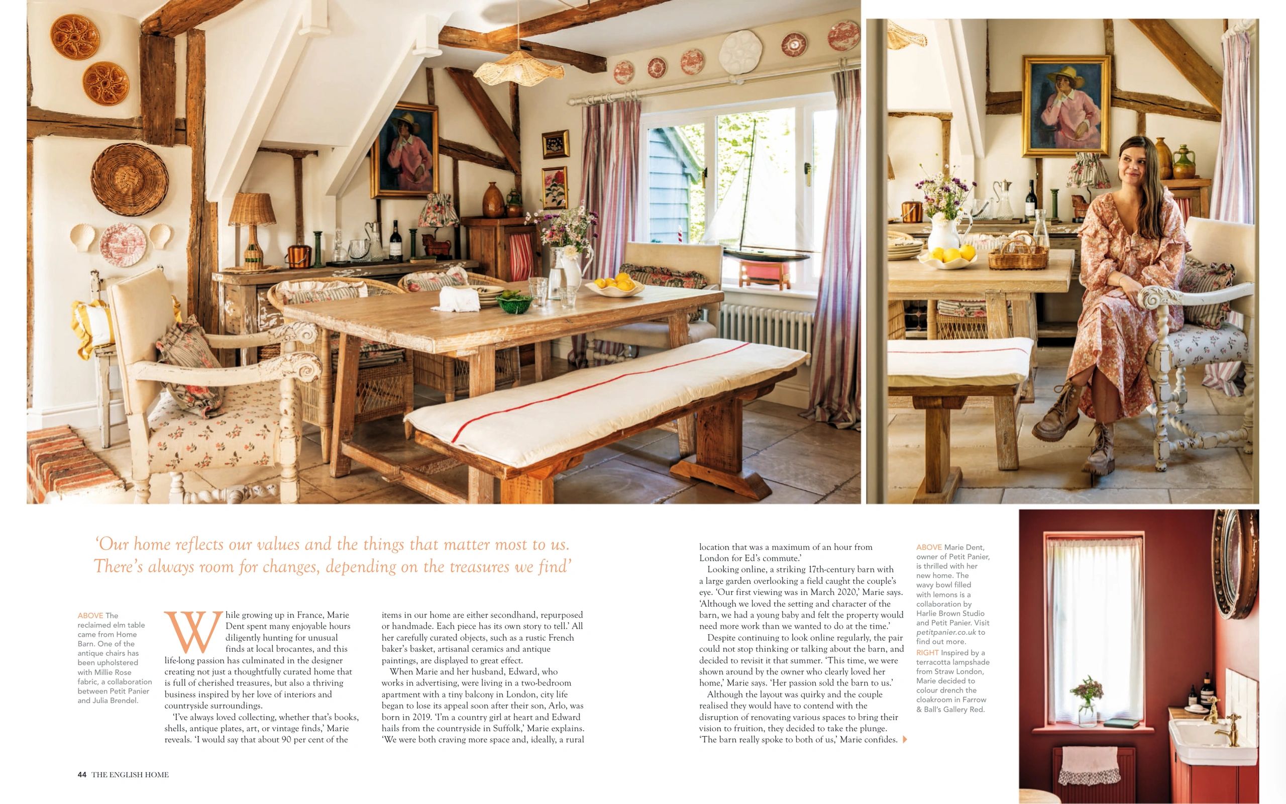 August 2025 Keen to create a home bursting with colour, interest and one-off finds, Petit Panier's Marie Dent, who grew up in France, has injected a historic barn with her flair for interiors and joie de vivre.